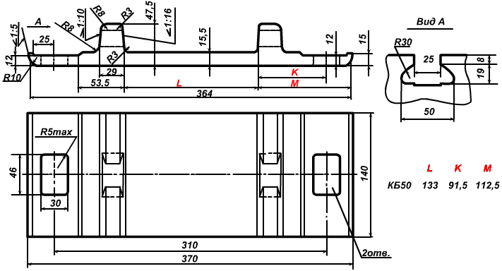 | Подкладка крепится к железобетонной шпале закладными болтами М22х175, а крепление рельса Р-50 к подкладке осуществляется при помощи клеммных болтов М22х75. B сборе раздельное промежуточное скрепление КБ50 представляет собой весьма прочную и устойчивую конструкцию. |